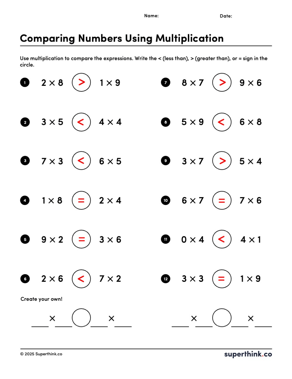 In this Comparing Numbers Using Multiplication worksheet, students are asked to: