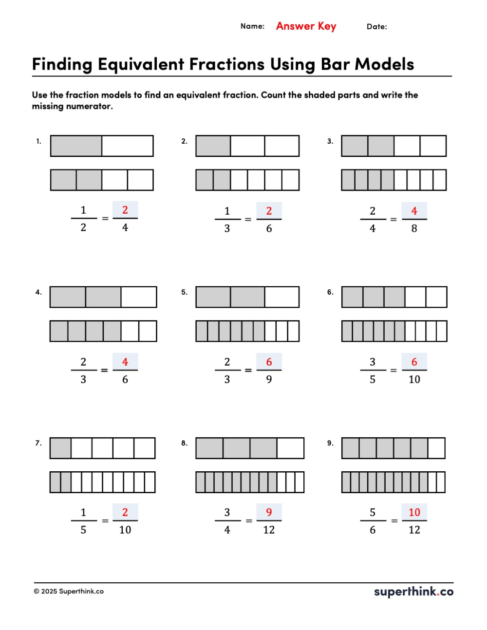 This worksheet has 9 problems with denominators up to 12. It’s perfect for fraction lessons in grades 3 and 4.