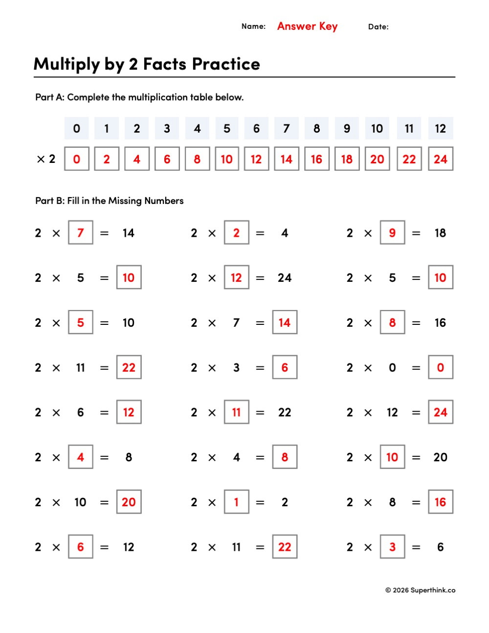 On this worksheet, students complete two parts. In Part A, they fill in the multiplication table for the 2 facts from 0 through 12. In Part B, they solve missing-number multiplication problems using the 2 times table. Some problems ask students to fill in the missing factor, while others ask for the missing product.