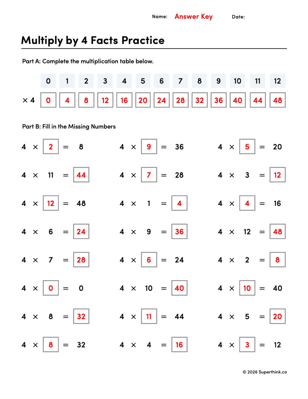 On this worksheet, students complete two parts. In Part A, they fill in the multiplication table for the 4 facts from 0 through 12. In Part B, they solve missing-number multiplication problems using the 4 times table. Some problems ask students to find the missing factor, while others ask for the missing product.