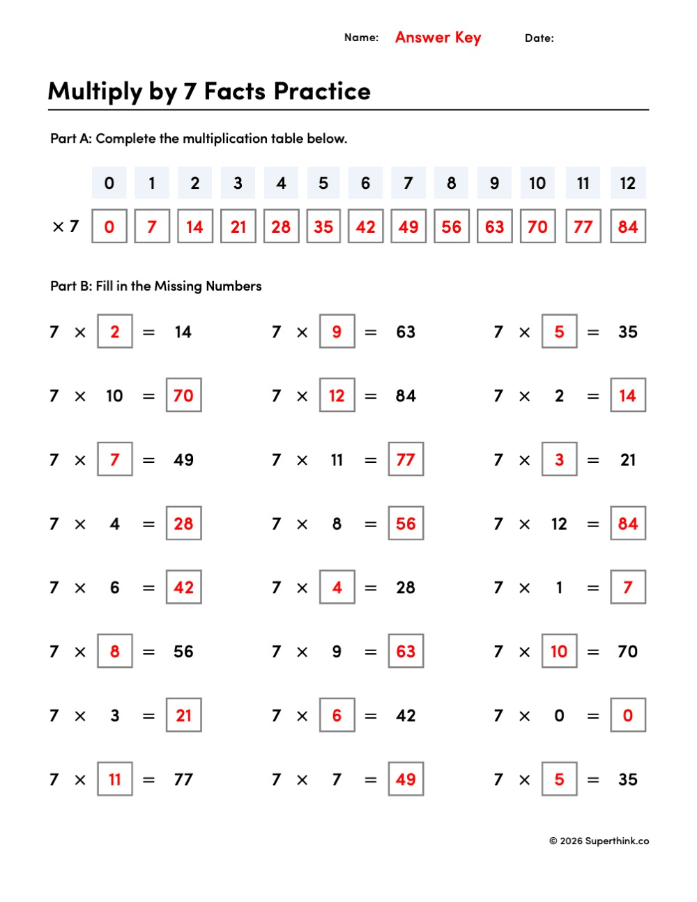On this worksheet, students complete two parts. In Part A, they fill in the multiplication table for the 7 facts from 0 through 12. In Part B, they solve missing-number multiplication problems using the 7 times table. Some problems ask students to find the missing factor, while others ask for the missing product.