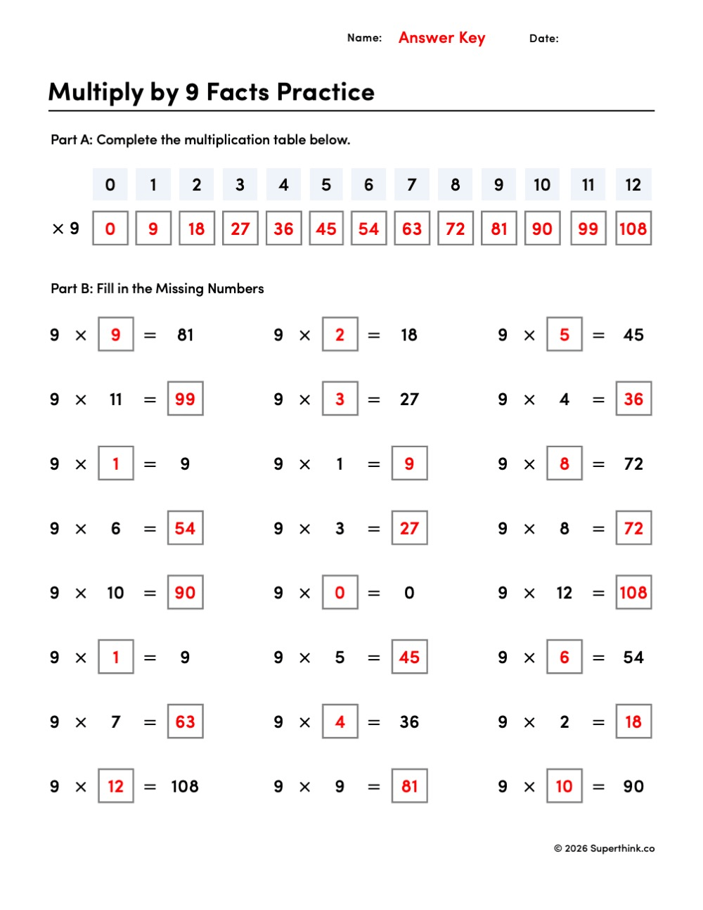 On this worksheet, students complete two parts. In Part A, they fill in the multiplication table for the 9 facts from 0 through 12. In Part B, they solve missing-number multiplication problems using the 9 times table. Some problems ask students to find the missing factor, while others ask for the missing product.