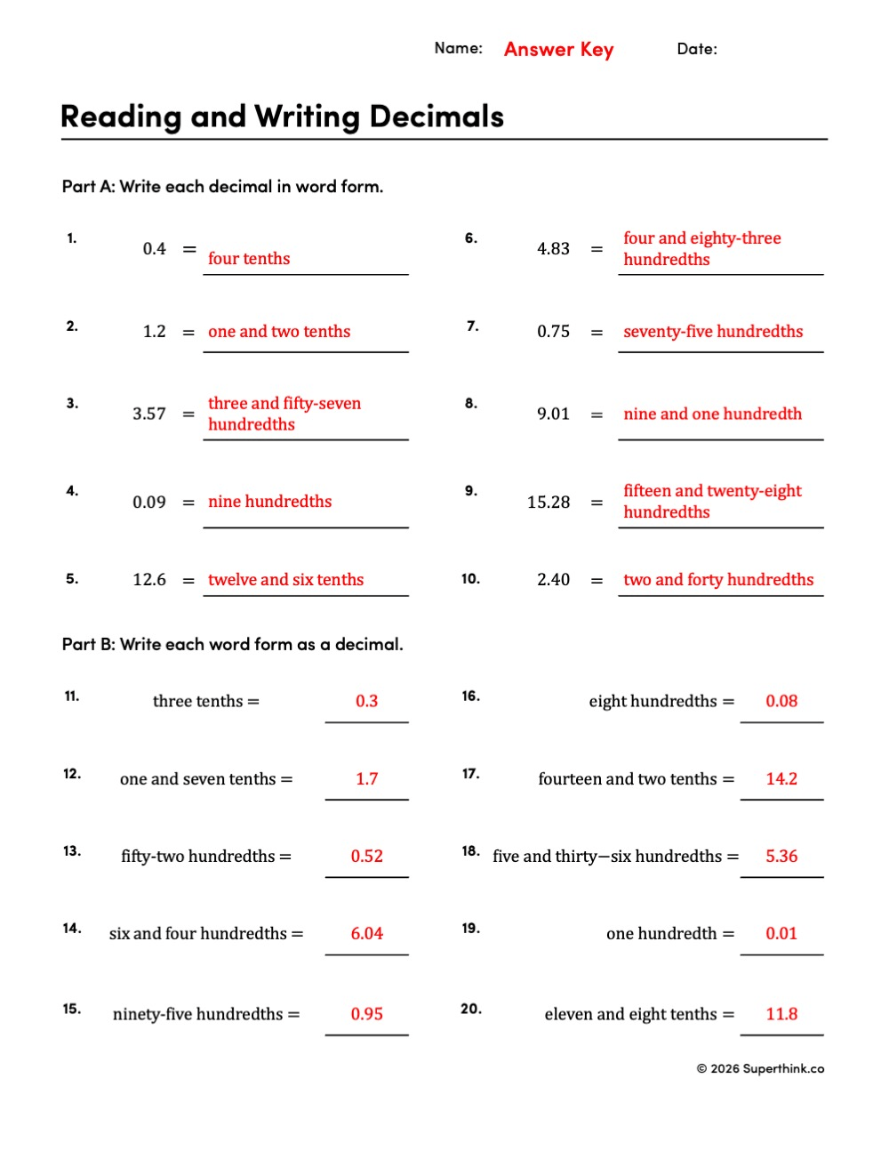 On this worksheet, students complete two parts. In Part A, they write each decimal in word form. In Part B, they read the word form and write each number as a decimal. This two-part structure gives students practice moving back and forth between the way decimals look and the way decimals are read.